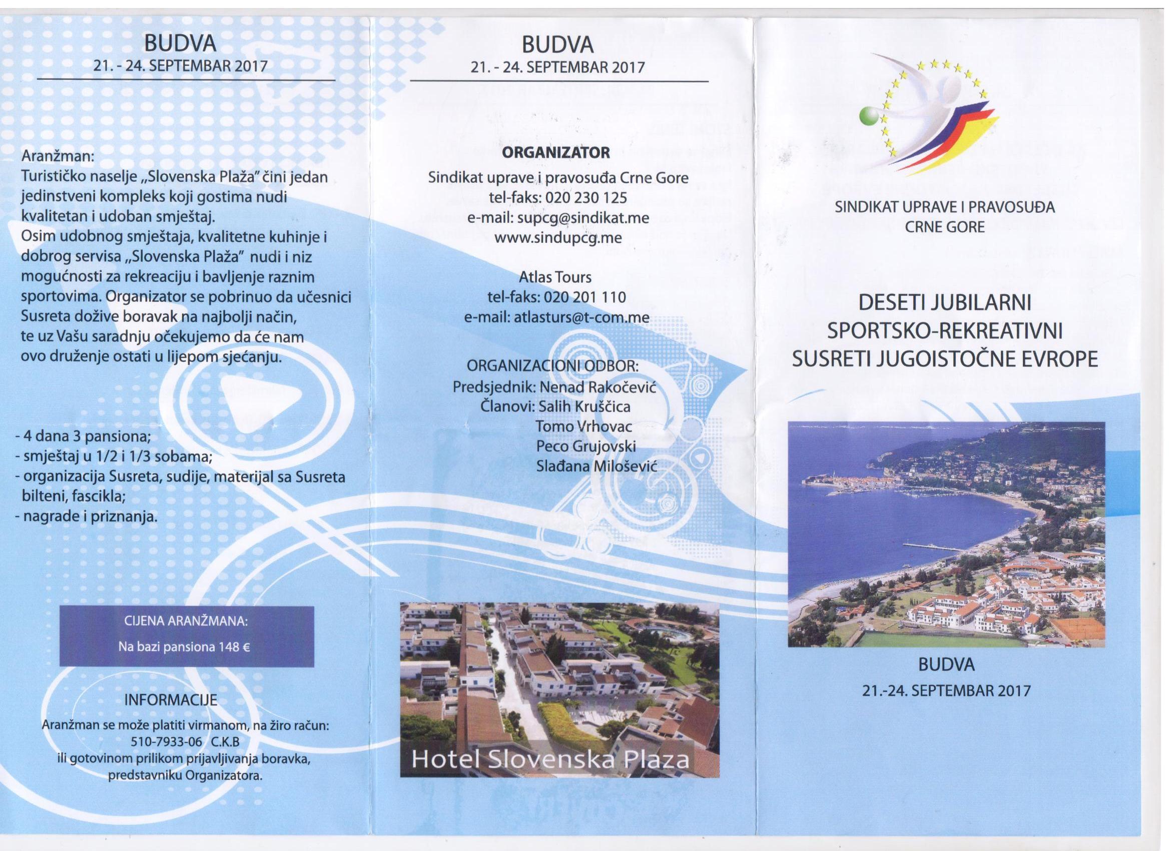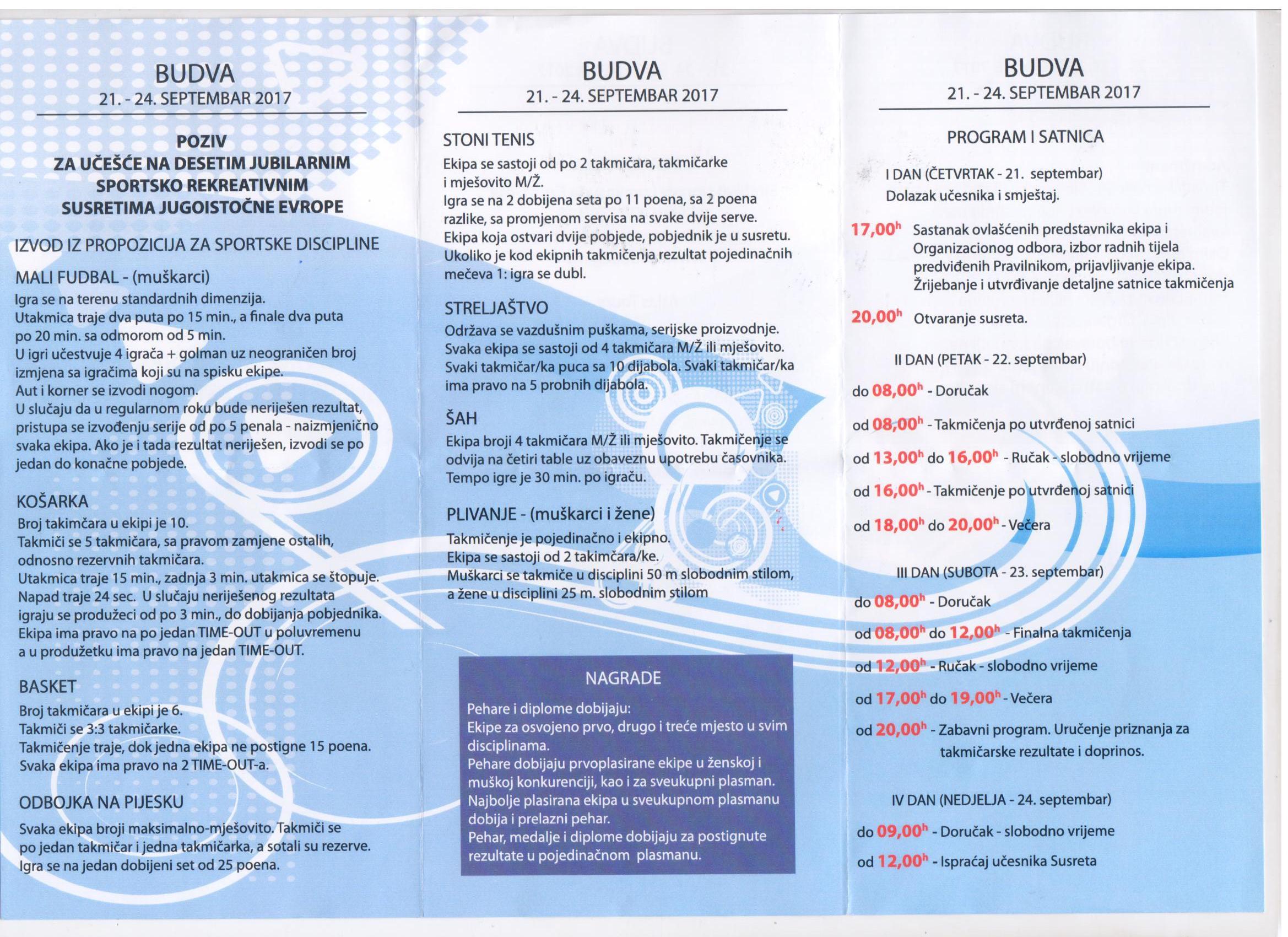 upoznajemo Vas da će se DESETI SPORTSKO-REKREATIVNI SUSRETI JUGOISTOČNE EVROPE ove godine održati u Budvi u periodu od 21. do 24. septembra.